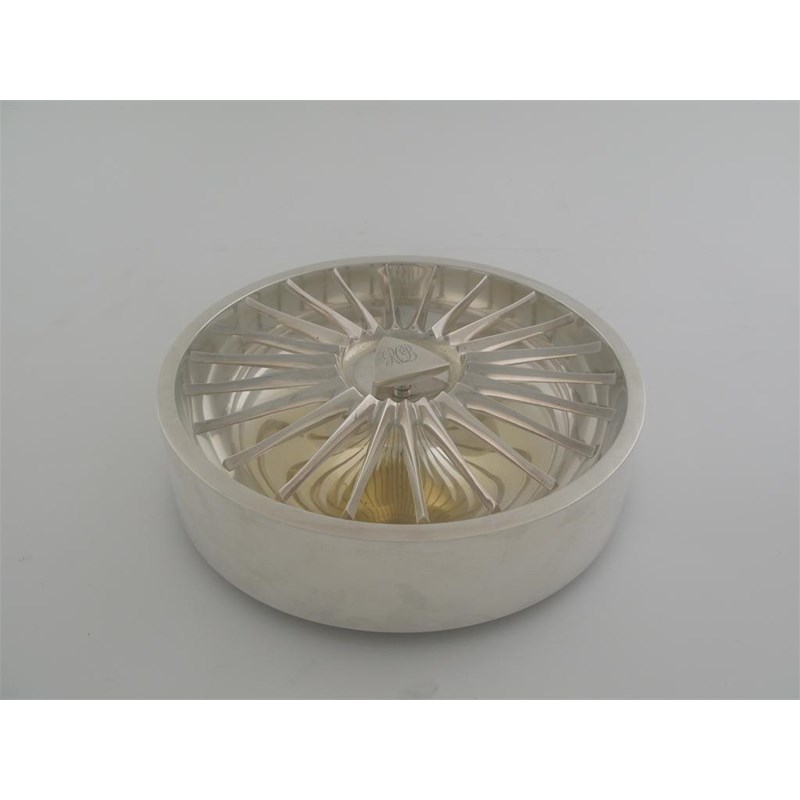 A modern squat circular rosebowl, with plain vertical sides and a removable grille resembling a stylised sunburst, the centre initialled, the base inscribed "Designed for Roger and Frances Beale, by Alex Styles and made by Garrard", by Garrard & Co, London 1969, 7.8in (20cm) diameter, 41.5oz.