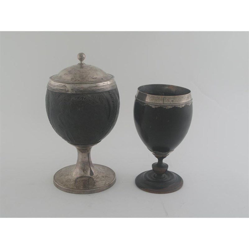 A George III mounted coconut goblet and cover, with a gilt interior, the bowl carved with fronds of foliage centred by a romantic coat of arms, by William Bateman, London 1817, 8.25in (21cm) high, together with another mounted coconut goblet, by T. Phipps & E. Robinson, London c.1785. (2)