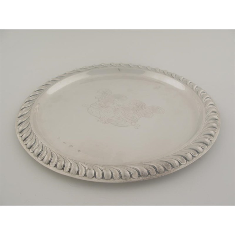 A James II circular stand, with a moulded, swirl fluted border, the centre engraved with a large coat of arms within plumed mantling, maker's mark "IC" mullet below* London 1687 (lacking foot), 13.75" (35cm) diameter, 27oz.