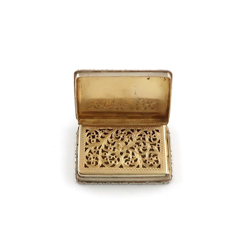 rectangular form, the hinged cover with a scene of the castle and round tower, reeded sides and engine-turned base, foliate borders, with a vacant cartouche, the interior with a pierced and engraved silver-gilt foliate scroll grille, length 4.2cm, approx. weight 0.9oz.