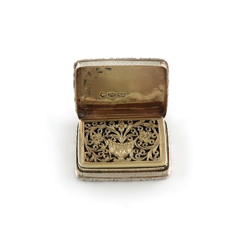 rectangular form, the hinged cover with a scene of the cathedral, engine-turned sides and base, foliate borders, with a vacant cartouche, the interior with a pierced and engraved silver-gilt urn and foliate scroll grille, length 4.2cm, approx. weight 1.1oz.