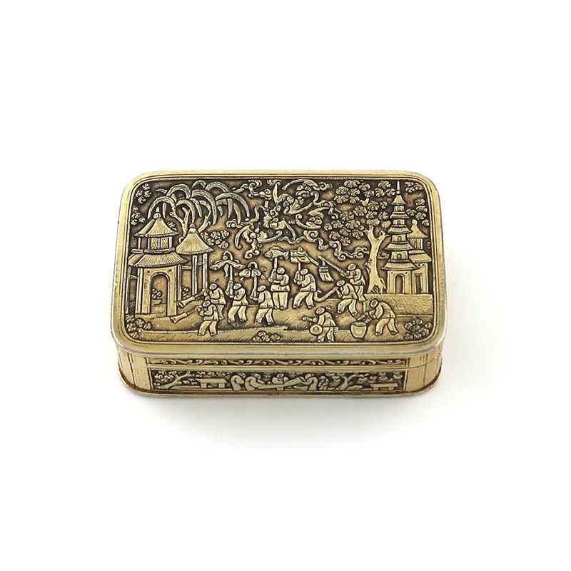 rectangular form, chased with figural scenes in landscape settings, length 6.5cm, approx. weight 3.9oz.
