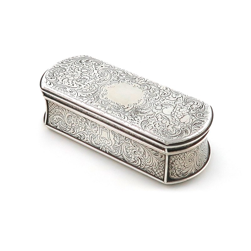 rounded rectangular form, engraved foliate decoration, the base engraved with a lyre and sheet music, gilded interior, length 11cm, approx. weight 5.6oz.