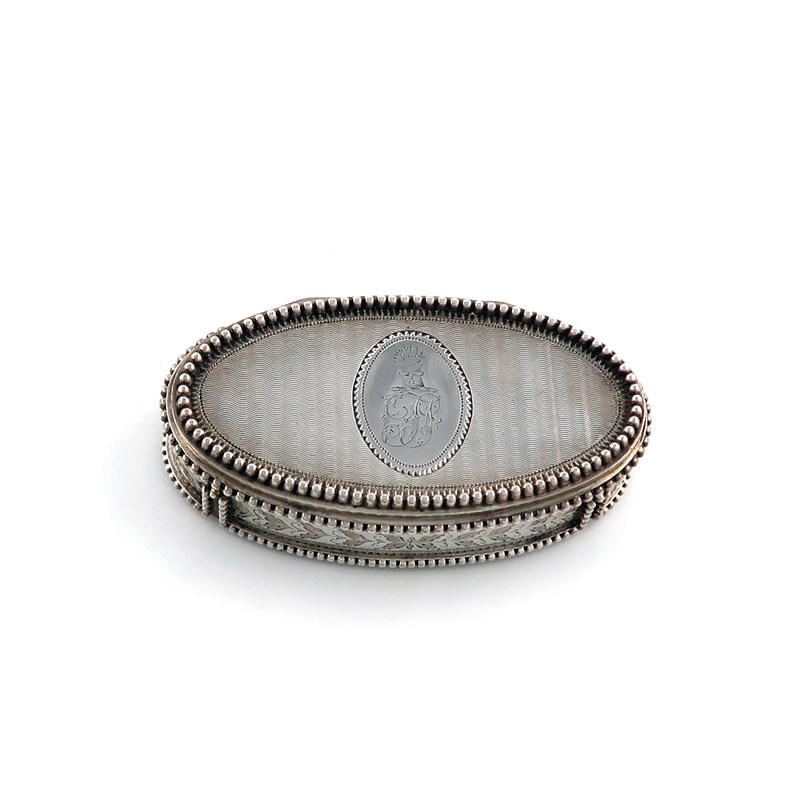 oval form, engine-turned decoration, beaded borders, the cover with a crest and initials, gilded interior, length 9cm, approx. weight 3.6oz.