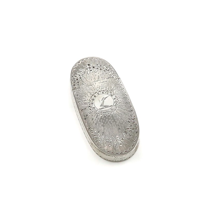oblong form, bright-cut decoration, the flush hinged cover opens to reveal an inner silver-gilt powder box with pierced holes and a revolving cover, the interior of the hinged cover inset with a mirror, engraved with a crest, length 8.8cm.