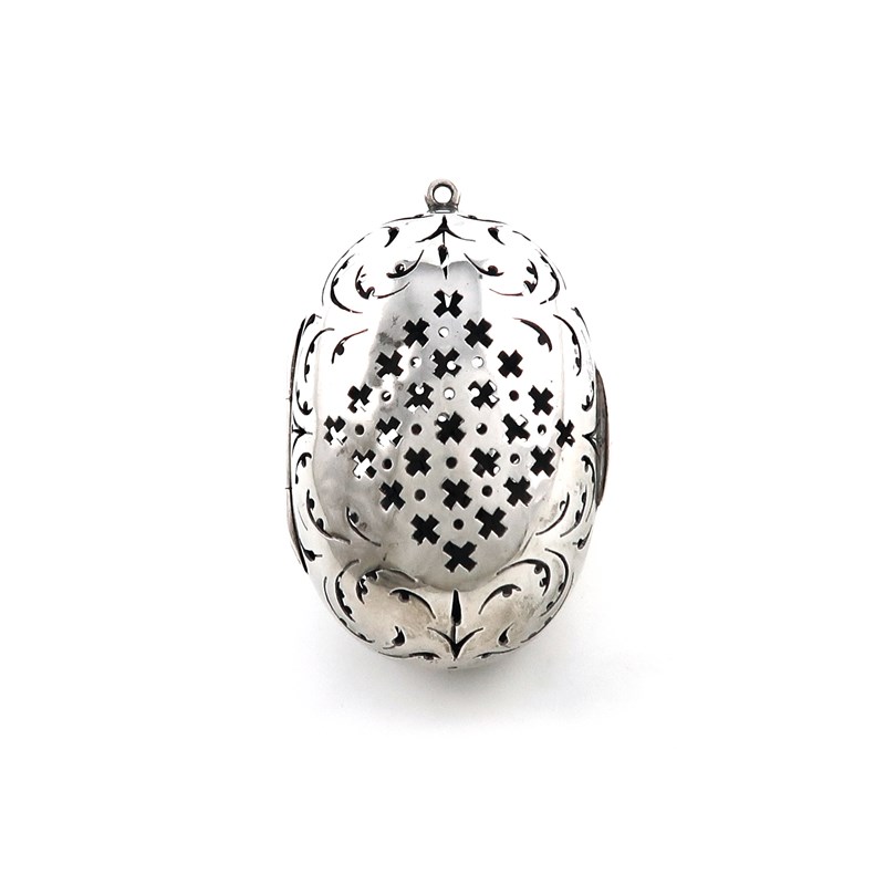 ovoid form, pierced with foliate scroll and mullet decoration, hinged cover with a ring attachment, length 6.3cm, approx. weight 1.3oz.