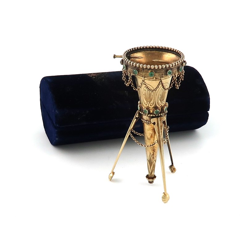 tapering circular form, engraved decoration, beaded borders, with a band of green cabochons and hanging chains, with two pins, and on three sprung legs, in a fitted case, length 12cm, approx. weight 2.2oz.