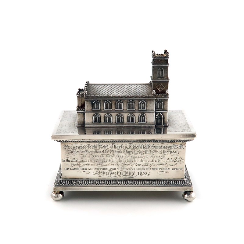 rectangular form, the front inscribed 'Presented to the Revd. Charles Sitchfield Swainson B.D. By the congregation of St. Mary's Church Edgehill near Liverpool, as a small memorial of grateful regard and affectionate earnestness and simplicity with which as a servant of the Lord, gentle unto all men and in the spirit of love of a sound mind, he laboured among them for twelve years on his ministerial office, Liverpool 15 Aug. 1834', the pull-off cover mounted with a model of the church, the interior with two compartments and two pull-off unmarked covers, on four bun feet, length 12.8cm, approx. weight 19.2oz.
