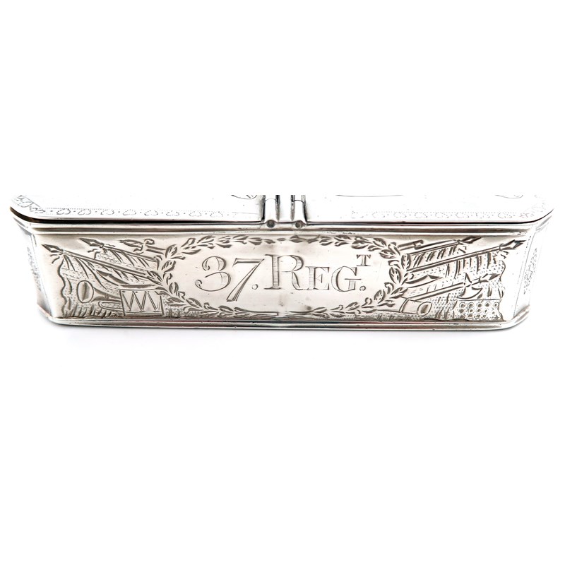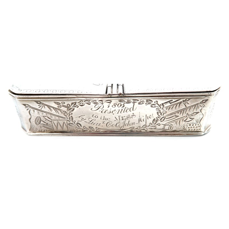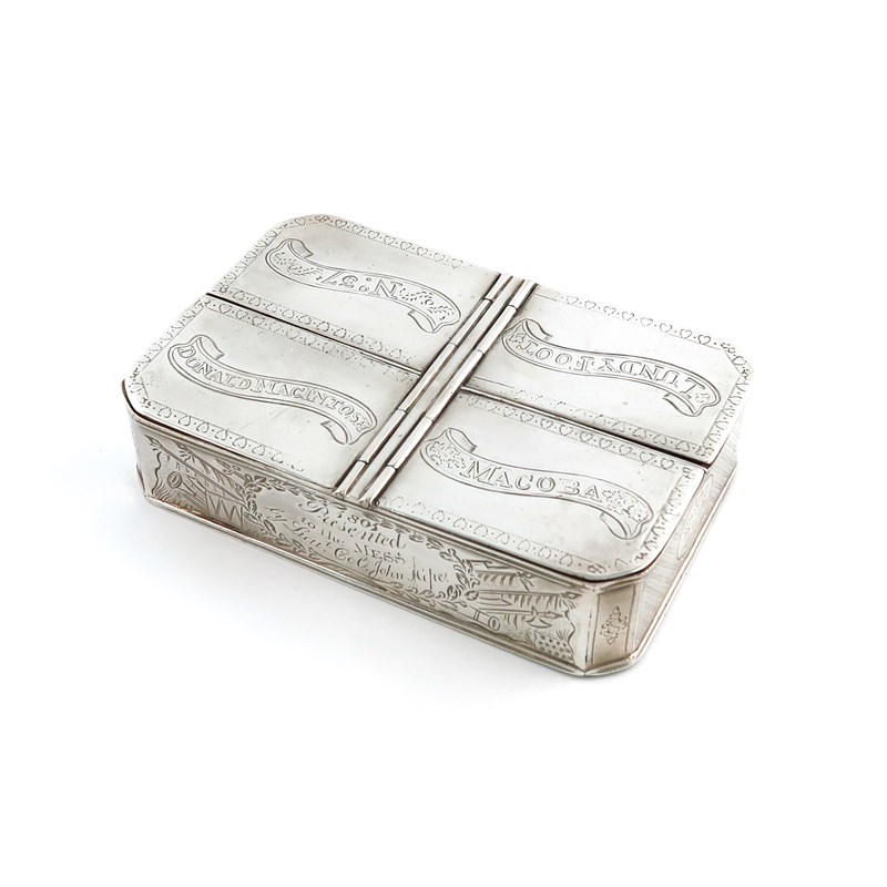 rectangular form, canted corners, with four hinged covers, inscribed 'Lundy Foot', 'No.37', 'Donald Mackintosh' and 'Macoba', the front inscribed '1801 Presented to The Mess by Lieut.Col. John Hope', the reverse inscribed '37 Regt.' gilded interior, length 14.8cm, approx. weight 16oz.