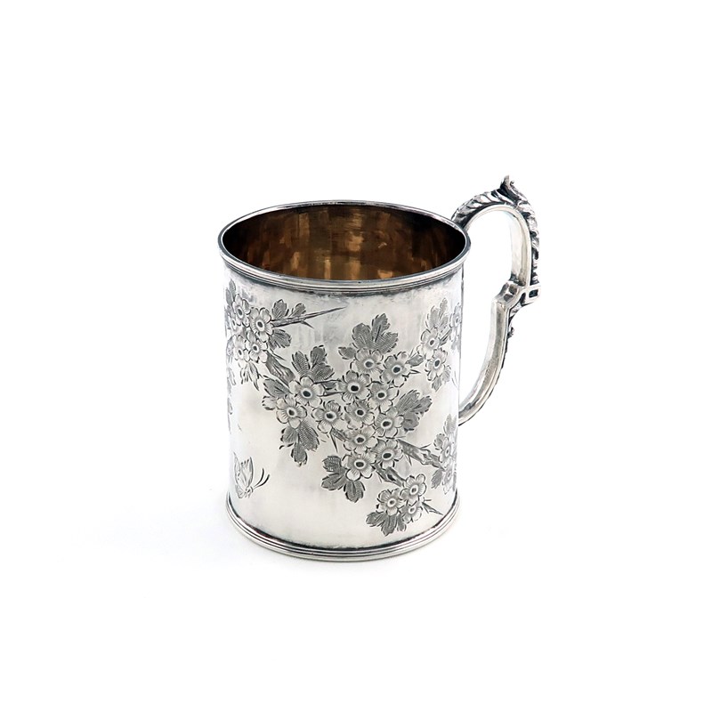 circular form, engraved with foliate decoration and butterflies, scroll handle, height 8.5cm, approx. weight 4.2oz.