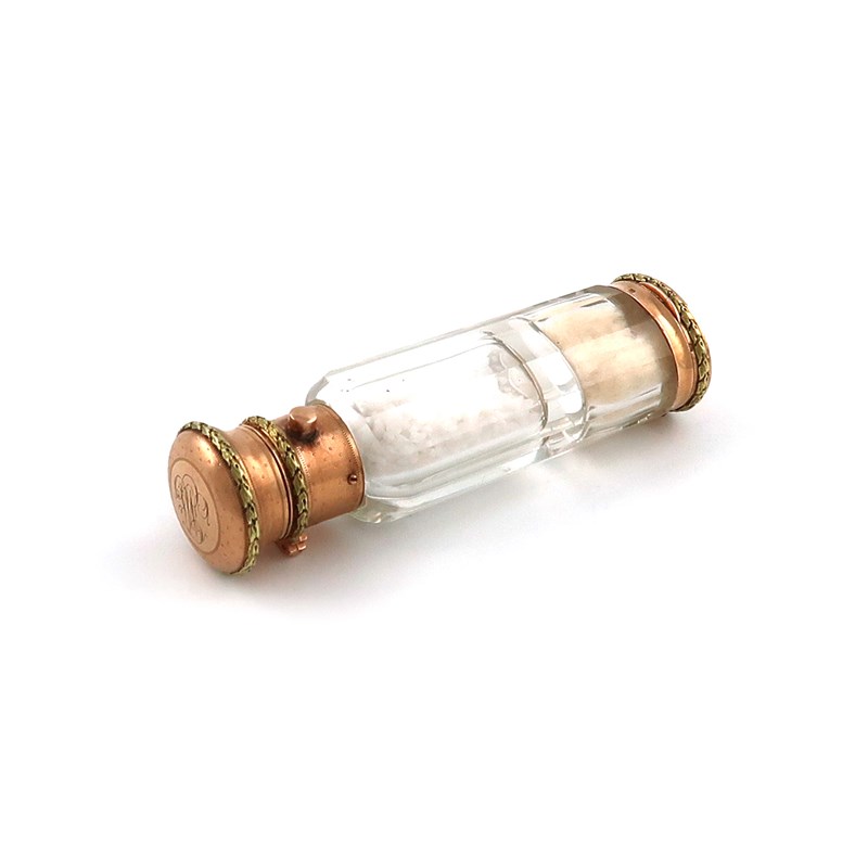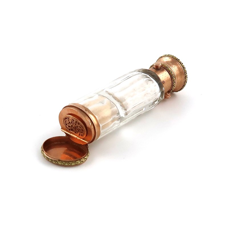 faceted cylindrical form, reed and spot decoration, foliate borders, the hinged cover with a push-button catch, the base with a hinged cover which opens to reveal a pierced grille, length 8cm.
