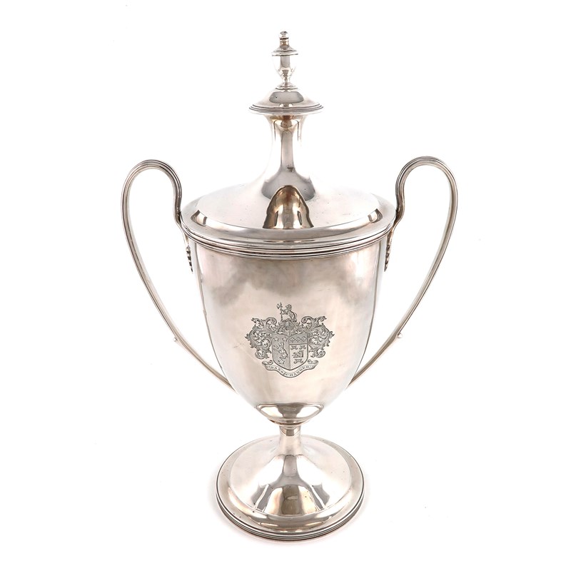 plain urn form, shell-capped scroll handles, the front engraved with an armorial, pull-off cover with an urn finial, on a raised circular foot, the underside inscribed 'This cup represents the value of gold lace taken off Hussar and Equery uniforms worn by Major General Sir Stanley Clarke', height 45cm, approx. weight 67oz.