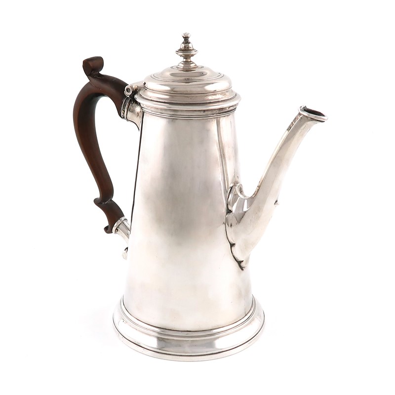 tapering circular form, wooden scroll handle, the hinged cover with a knop finial, faceted tapering spout, on a circular foot, the base scratch initialled 'E.G', height 21.5cm, approx. weight 23.7oz.