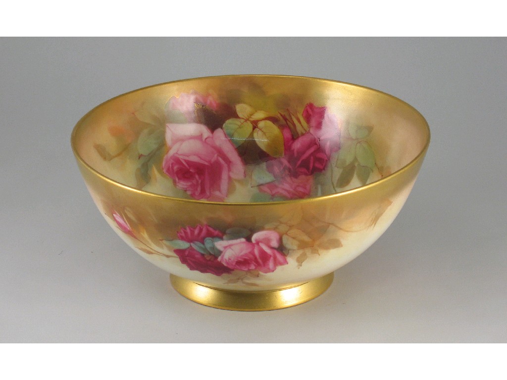 A large Royal Worcester bowl, painted inside and out with pink roses, signed 'Sedgley', c.1924, 26.2cm.