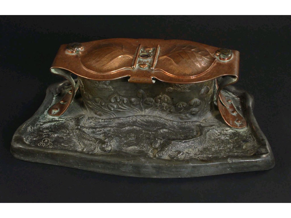 An interesting arts and crafts mixed metal double inkwell the pewter base modelled with fish