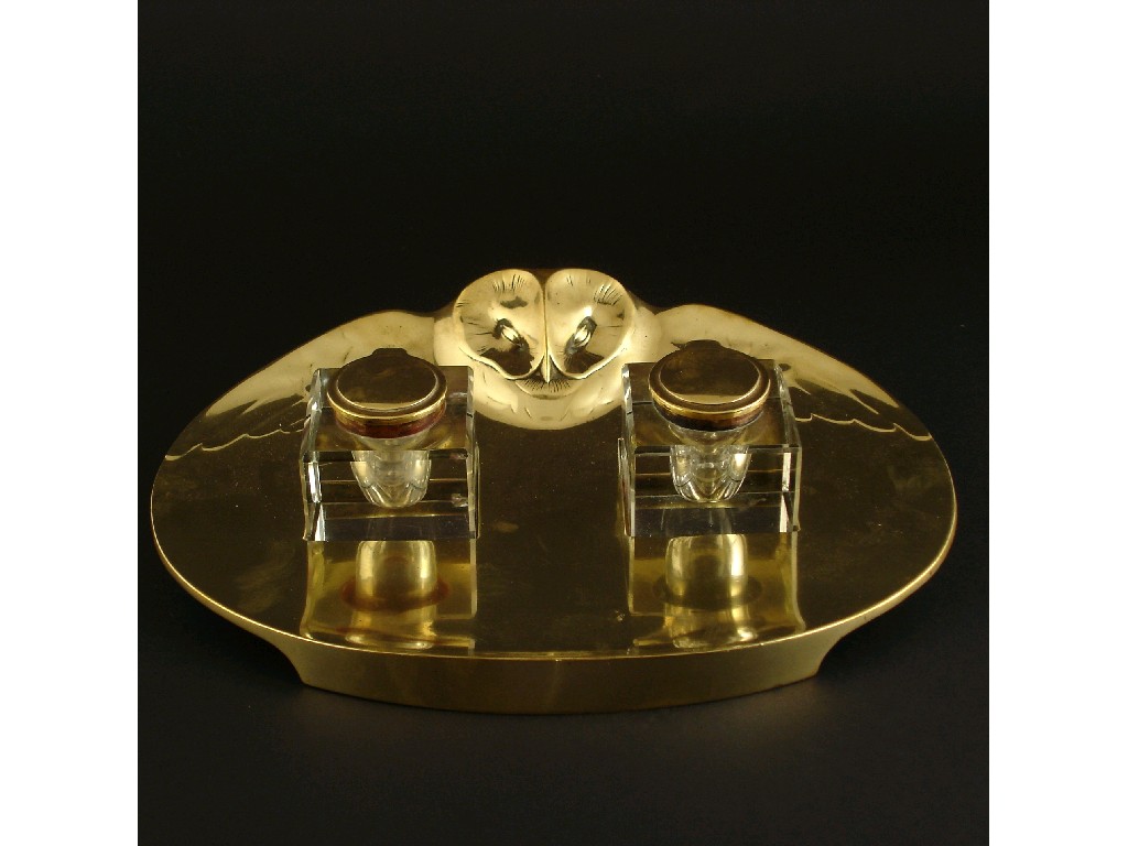 A Continental brass double inkwell cast in relief with an owl stamped marks 28cm. wide
