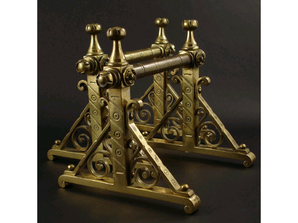 A pair of Benham & Froud brass and irons stamped marks 21cm. high