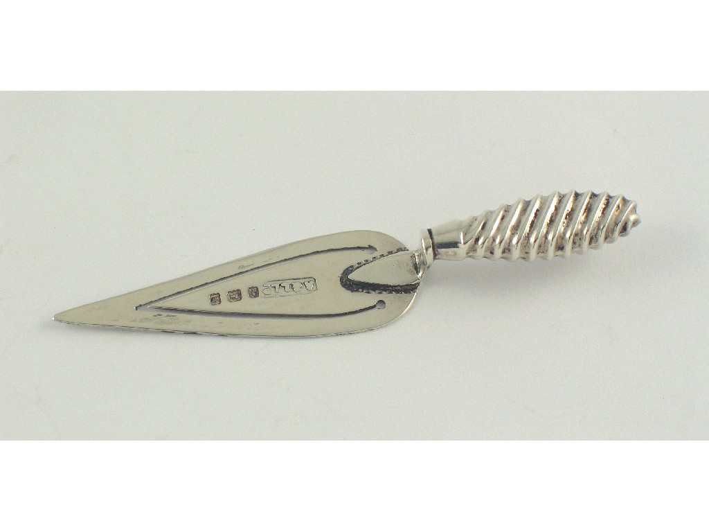 An Edwardian novelty bookmark, in the form of a trowel with a wrythen handle, by Adie & Lovekin, Birmingham 1905, 2.75in (7cm) long.