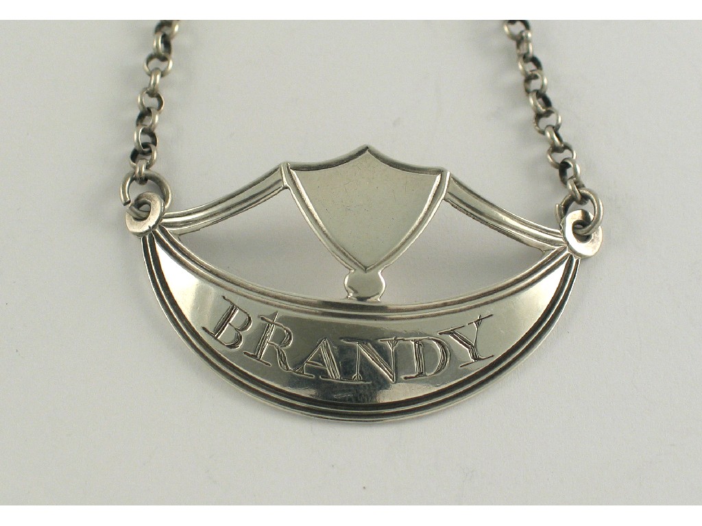 A George III crescent wine label, with shield surmount and thread borders, 'BRANDY', by Allen Dominy, London 1794.