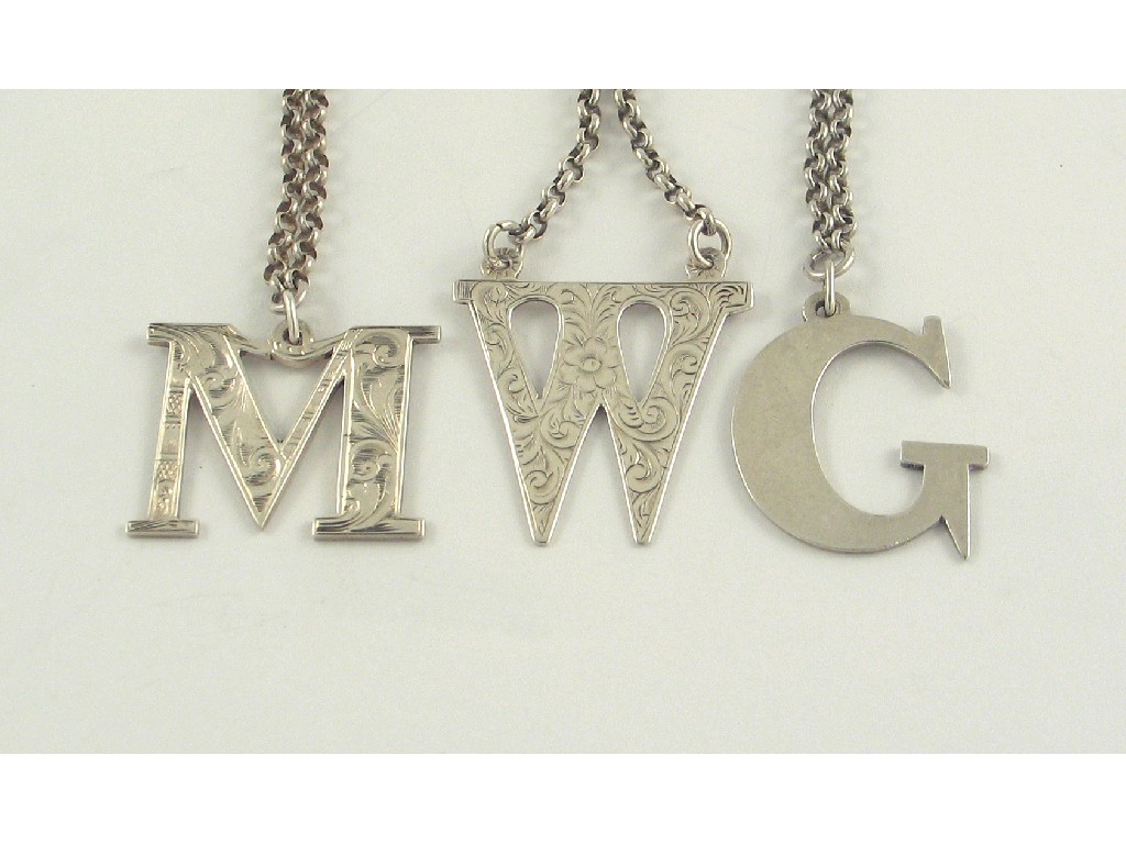 Three Victorian, cut-out letter wine labels "G", "M" & "W", all with engraving, by two maker's, George Unite & Hilliard & Thomason, Birmingham 1849/1867/1876. (3)