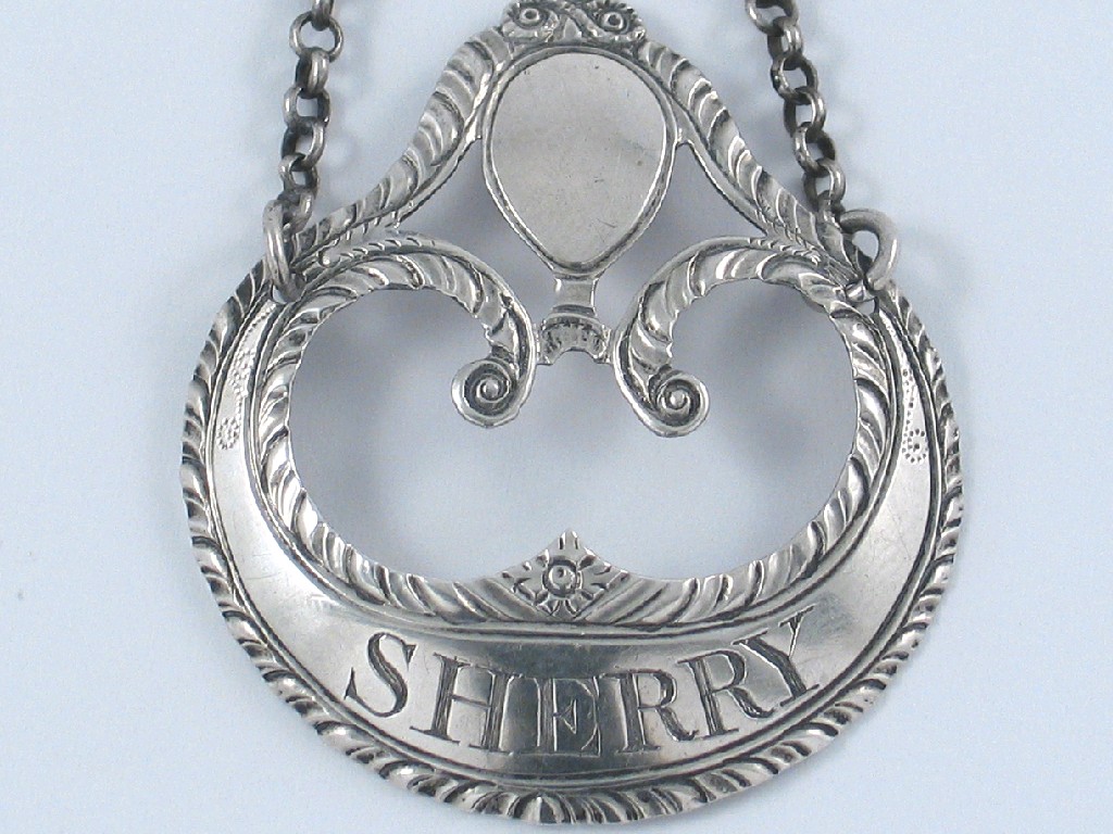 A George III enclosed crescent wine label, with an openwork cartouche surmount and feather edging, incised 'SHERRY', makers mark only 'I.S (struck twice), possibly by Joseph Steward II ), London c.1775.