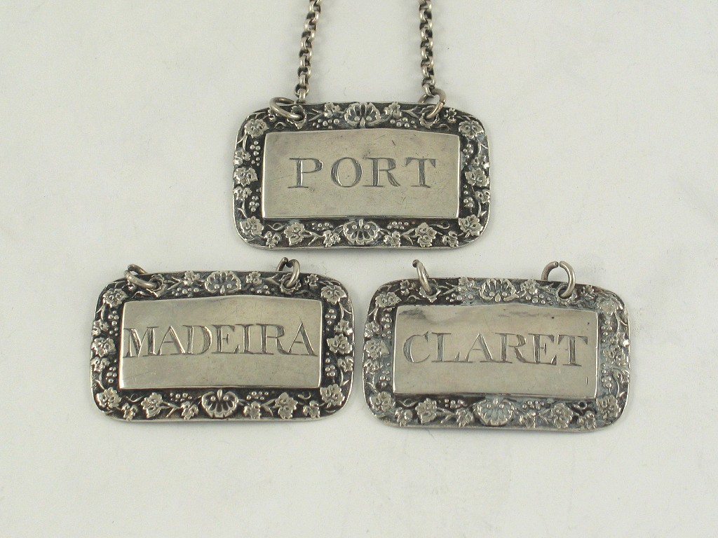 A George III set of three oblong wine labels with a stamped border of shells and fruiting vines " MADEIRA ", " PORT ", & " CLARET ", by Elizabeth Morley, London 1811. (3)