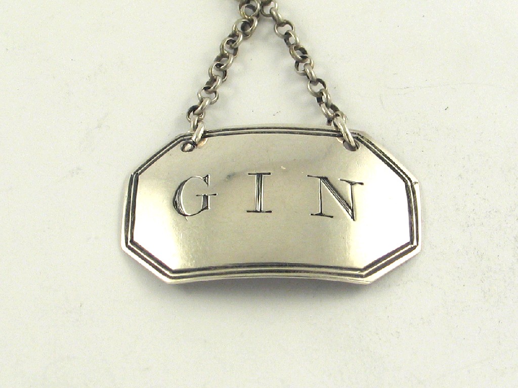 A George III canted oblong wine label, with a reeded border, incised "GIN", by S. Godbehere, E. Wigan & J. Bult, London 1801.