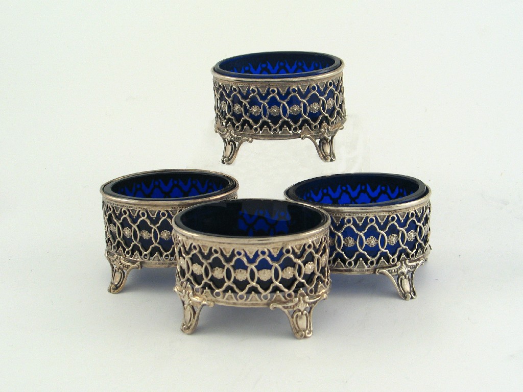 A set of four late 19th century French, pierced oval salts, on four splay feet with blue glass liners, maker's mark unclear, Paris last quarter of the 19th century, 3in (7.8cm) wide, 5.5oz weighable silver. (4)