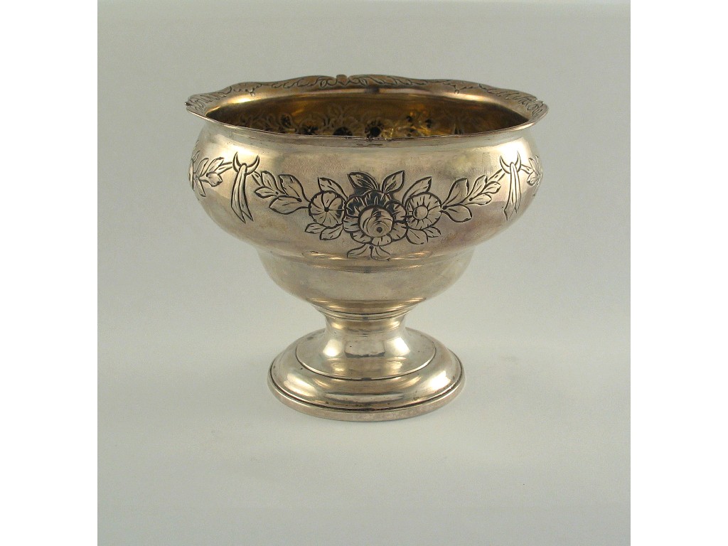 An early George III Scottish sugar bowl, on a pedestal foot, with an everting chased rim, a gilt interior and embossed fruit and floral festoons aroudn the sides, by James Gilsard, Edinburgh 1766, 4.3in (11cm) diameter, 7oz.
