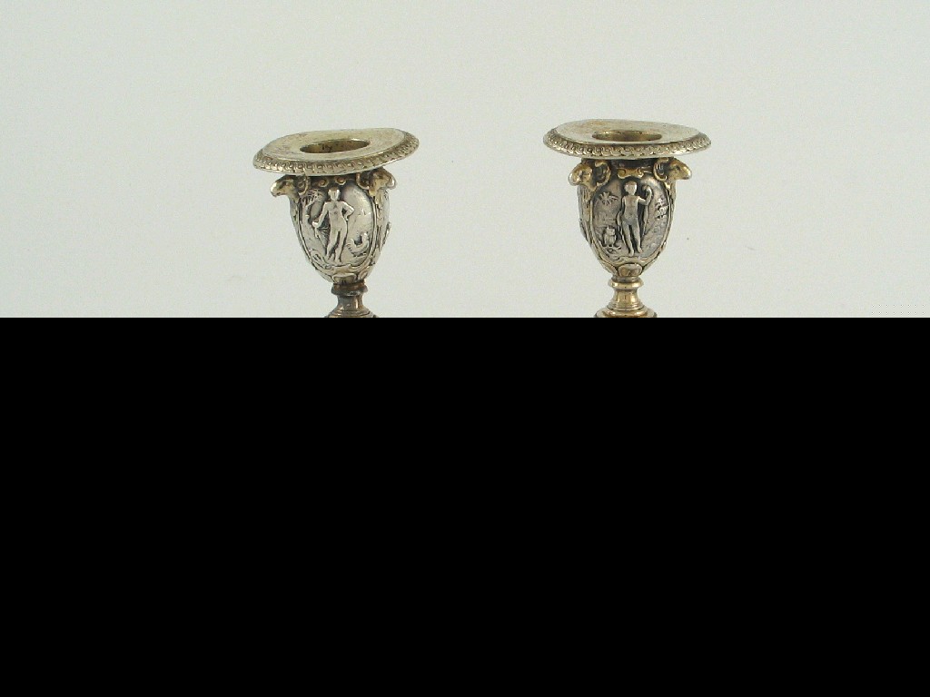 A pair of Victorian parcel-gilt plated candlesticks, relief decorated on domed circular bases with knopped, dwarf columns and urn shaped capitals with ram's mask decoration (one capital detached), by Elkington & Co c.1860, 5.5in (14cm) high. (2)