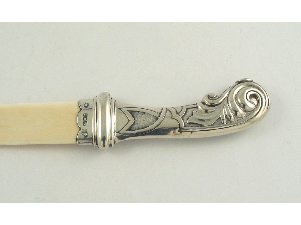 An Edwardian mounted ivory page turner or paperknife, with an embossed, pistol hilt, by Sampson Mordan & Co, London 1901, 13.9in (35.3cm) long.