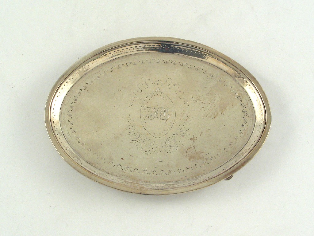 A George III engraved teapot stand, of oval outline, initialled, by John Hutson, London 1785, 6.5in (16.5cm) wide, 4oz.