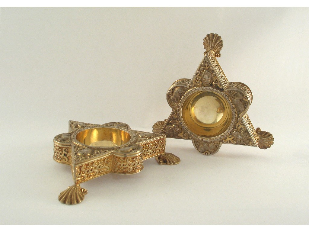 A pair of late Victorian silvergilt triform salts