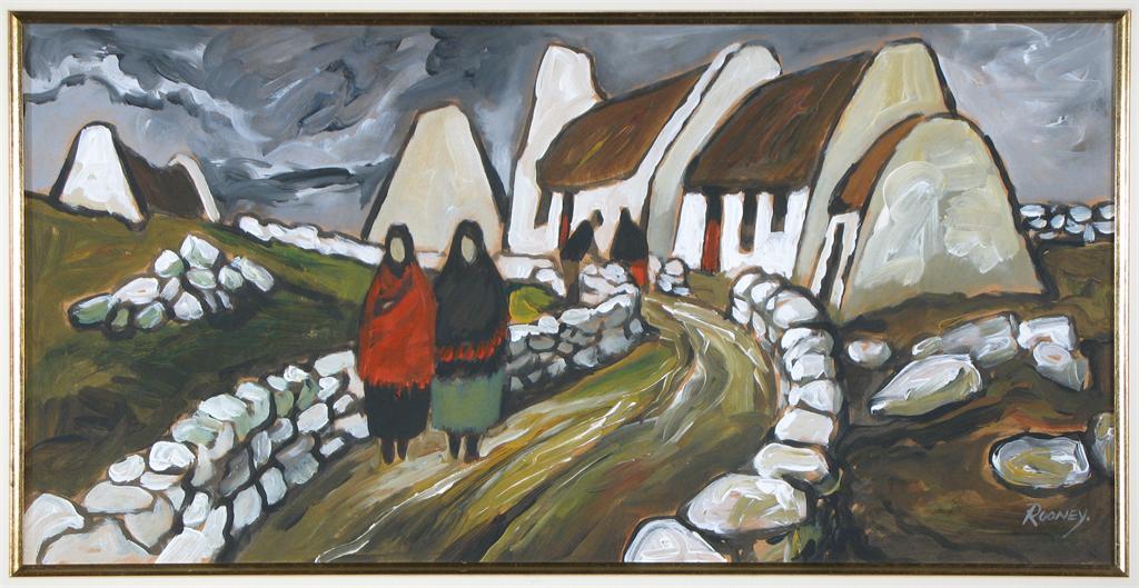 ‡ J. P. Rooney (Irish 20th Century) Women in a Connemara village Signed Oil on board 37 x 75cm;...