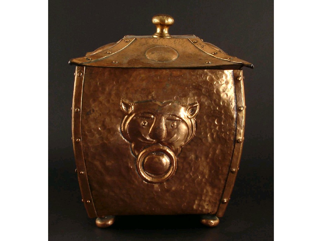 A James Dixon & Sons silver plated teapot and cover, with ivory finial, model T8688 stamped marks 16cm. high ; A John Pearson copper box and cover+ with lion mask stamped JP roundel 27cm. high.