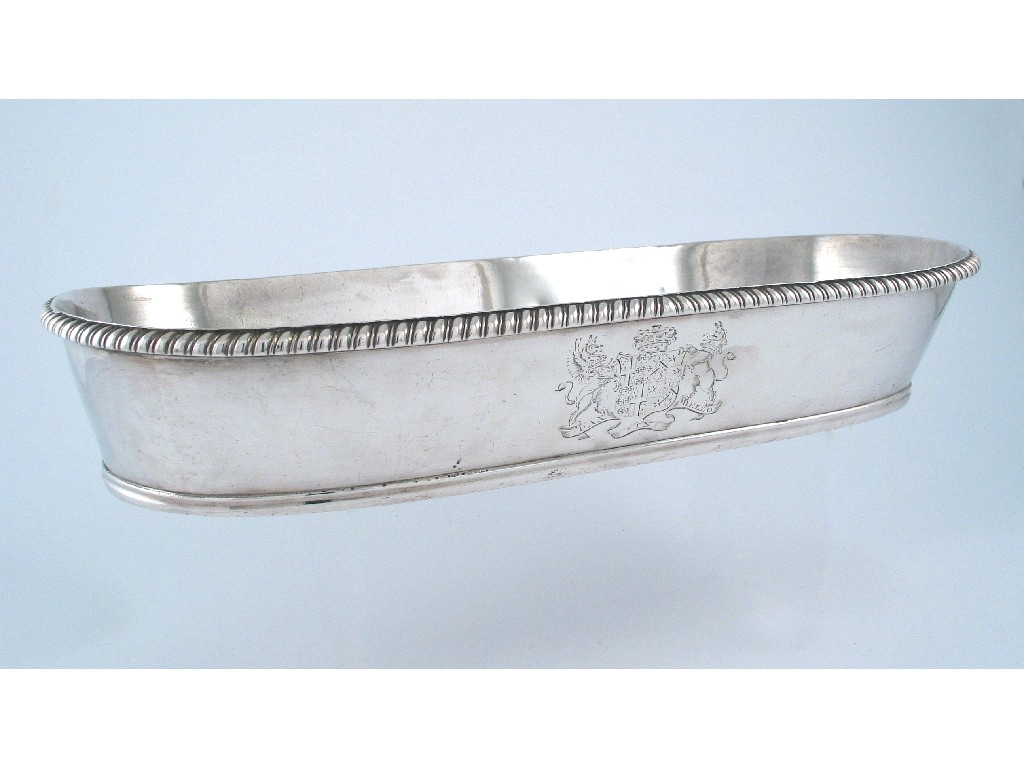 A George III knife tray of rounded oblong outline with a gadrooned border, maker's mark worn, London 1799, 15.75in (40cm) long, 51oz.