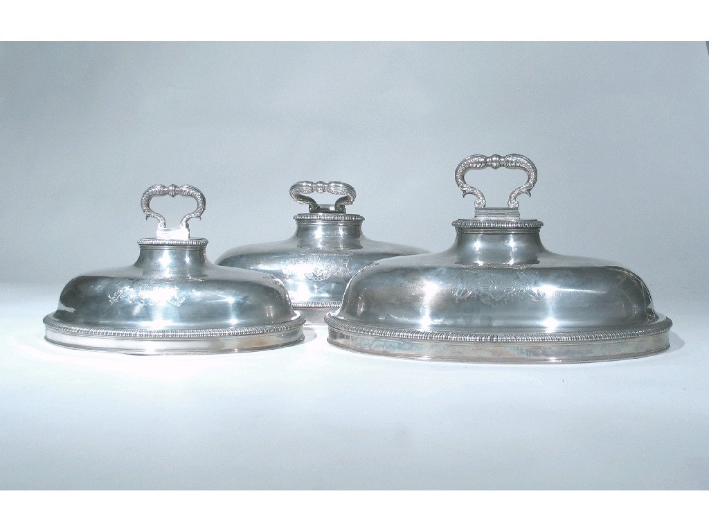 A pair and one small George II oval dish cover with gadrooned borders and hinged