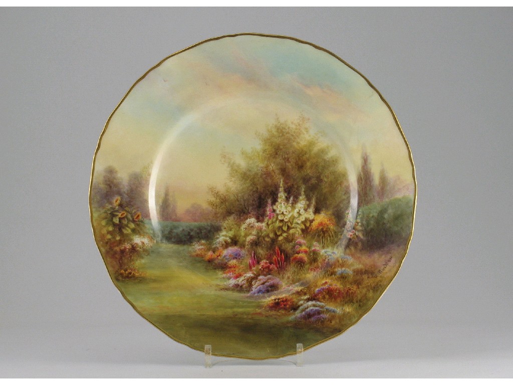 A Royal Worcester plate, painted with flowers in a garden, signed 'Rushton', black mark, 20th century, 27.5cm.