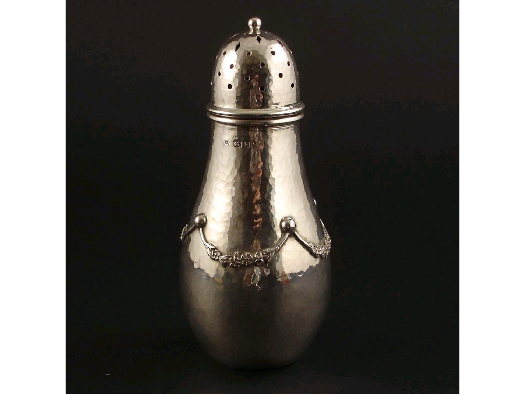 A silver sugar caster cast Garland decoration on hammered ground stamped FH