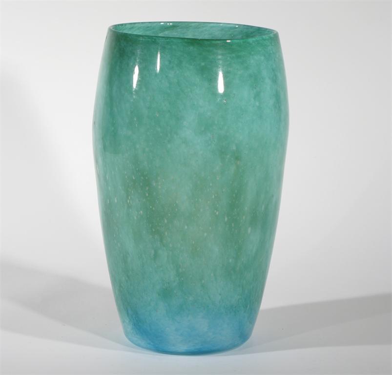 A Whitefriars Cloudy glass vase swollen cylindrical form, green glass graduating to blue foot, with white and air bubble inclusions, cased in clear unsigned 23cm. high