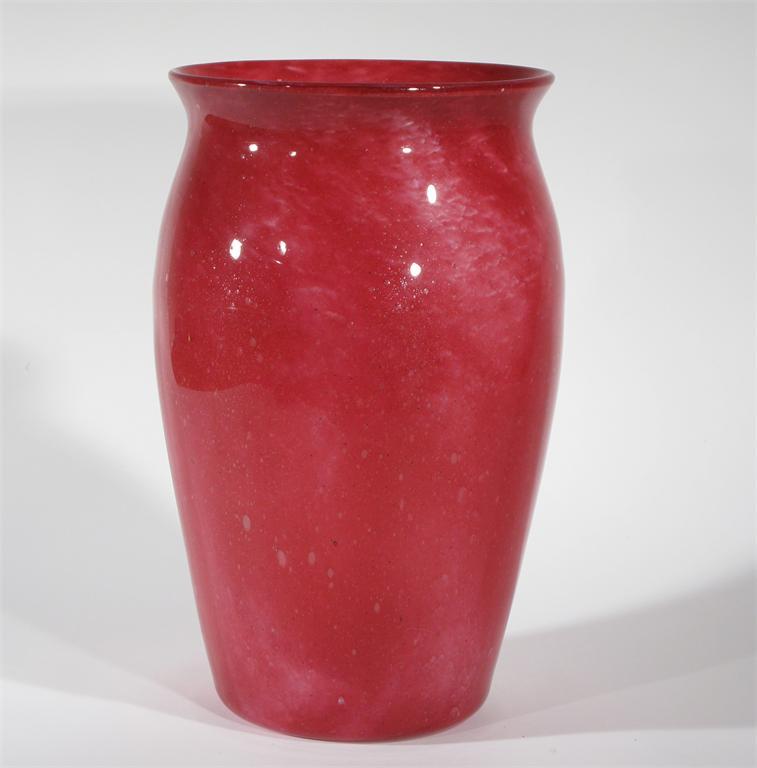 A Whitefriars Cloudy glass vase designed by Harry Powell, mottled pink with white and air bubble inclusions unsigned 30cm. high