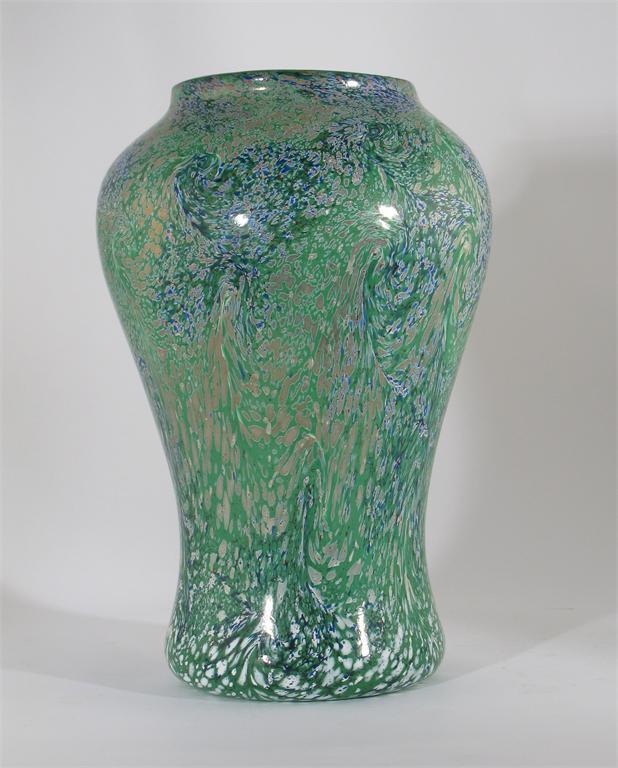 A Monart Paisley Shawl glass baluster vase pattern FA, shape probably III, surface decorated with green, blue, red and white all over whorled design, with clear liner unsigned 32cm. high Literature Ian Turner, Alison Clarke and Frank Andrews Ysart Glass, Volo Edition, London, page 104 and 105 for similar examples, and also illustrated on the front cover.