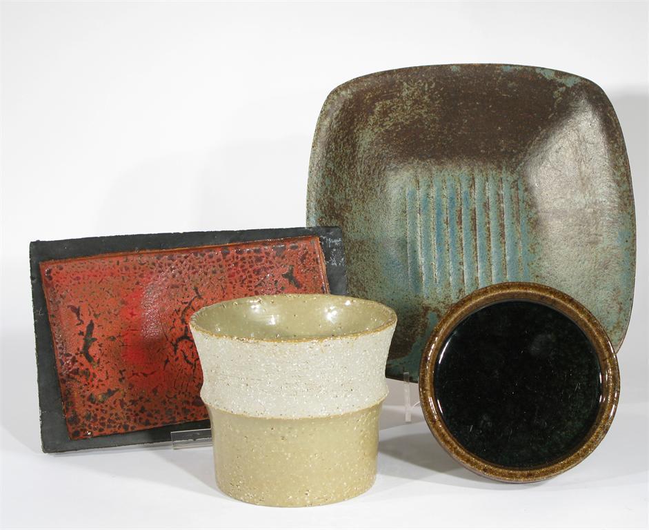 A Rorstrand stoneware vase by Hertha Bengston, flaring cylindrical form, partially glazed, a stoneware rectangular platter with crackled red glaze and two other dishes painted marks 13.5cm. high