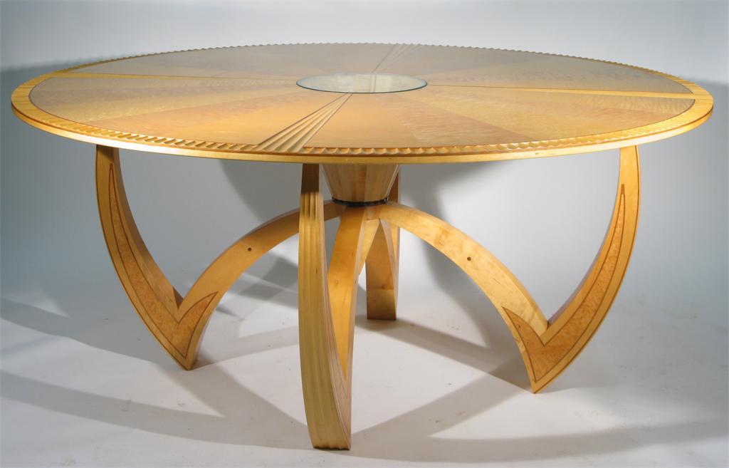 A maple centre table by Angus Ross, the circular top of figured maple segments, with inlaid walnut stringing, surrounded with fluted maple edging, on tapered maple legs, 1996, with original design