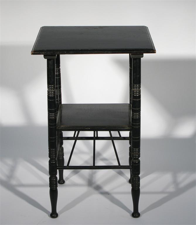 An Aesthetic Movement ebonised wood side table after a design by E W Godwin, turned legs, square section top and shelf unsigned 66cm. high