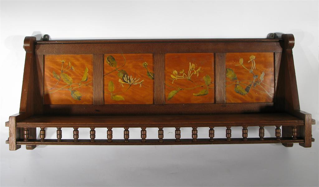 An Aesthetic Movement wall shelf peg-joint construction, with turned wood under tier, with four painted back panels of honeysuckle unsigned 68.5cm. wide