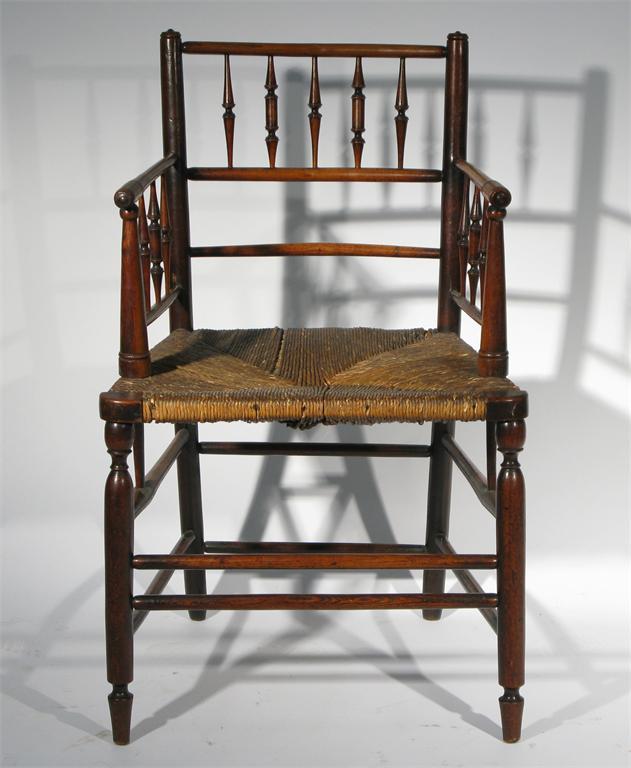 A rush seated Sussex armchair with turned bobbin back splats unmarked 84cm. high