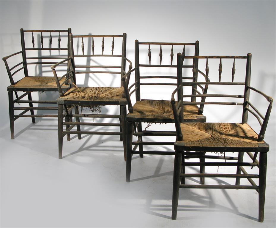 Eleven various ebonised wood and rush seated Sussex chairs unsigned 85cm. high