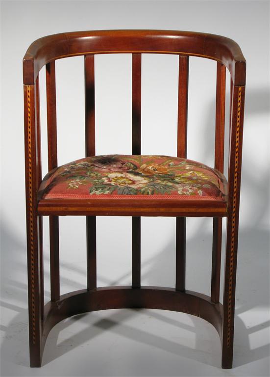 An Arts and Crafts mahogany tub chair with inlaid simple border, embroidered seat unsigned 80cm. high