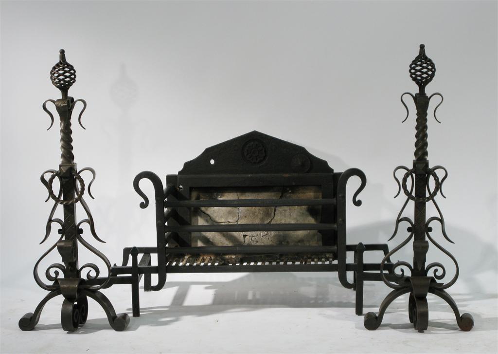 A large burnished iron fireplace from Bolney Court, Oxfordshire, with grate, ashtray and firedogs, the dogs with twist and scroll stems unmarked 151cm. wide
